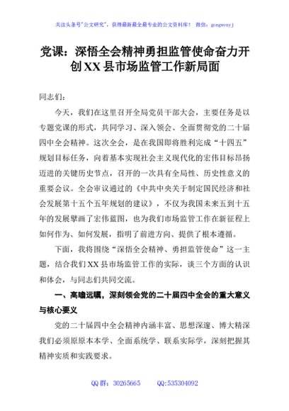 / 党课:深悟全会精神勇担监管使命奋力开创XX县市场监管工作新局面