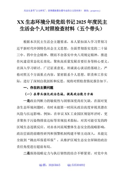 / XX生态环境分局党组书记2025年度民主生活会个人对照检查材料(五个带头)