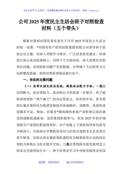 / 公司2025年度民主生活会班子对照检查材料(五个带头)