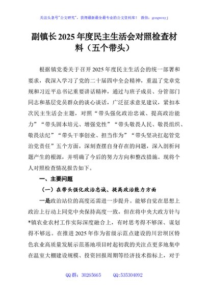 / 副镇长2025年度民主生活会对照检查材料(五个带头)