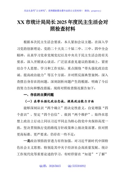 / XX市统计局局长2025年度民主生活会对照检查材料