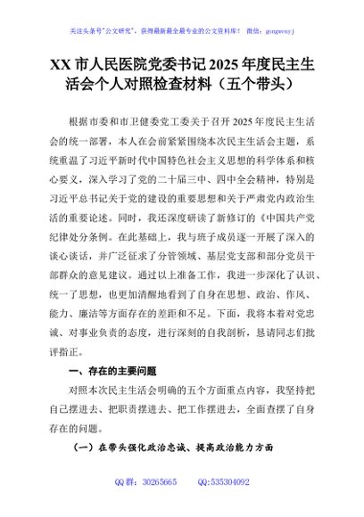 / XX市人民医院党委书记2025年度民主生活会个人对照检查材料(五个带头)
