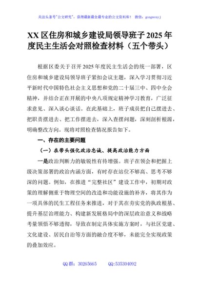 / XX区住房和城乡建设局领导班子2025年度民主生活会对照检查材料(五个带头)