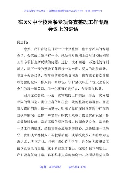 / 在XX中学校园餐专项督查整改工作专题会议上的讲话