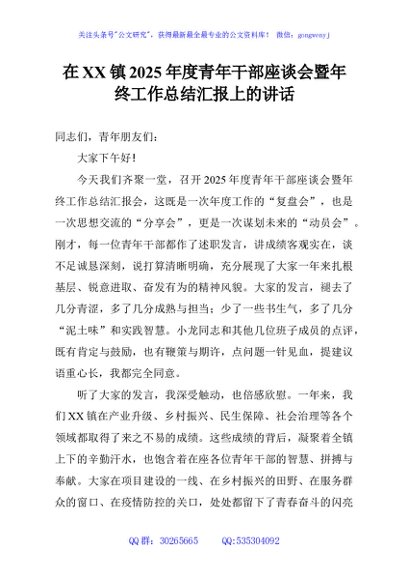 / 在XX镇2025年度青年干部座谈会暨年终工作总结汇报上的讲话