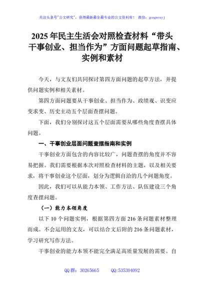 / 2025年民主生活会对照检查材料“带头干事创业、担当作为”方面问题起草指南、实例和素材