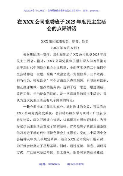 / 在XXX公司党委班子2025年度民主生活会的点评讲话
