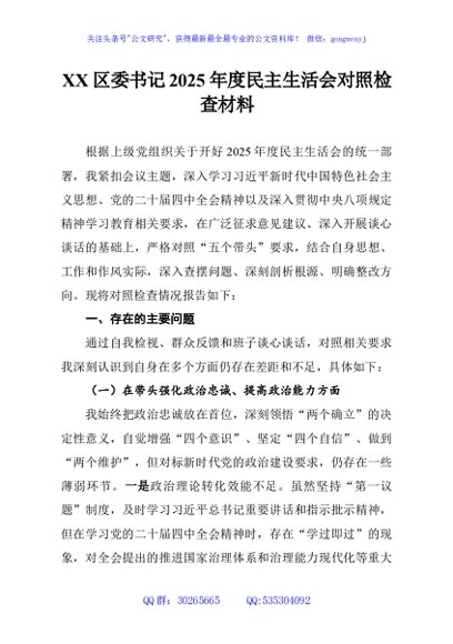 / XX区委书记2025年度民主生活会对照检查材料