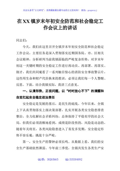 / 在XX镇岁末年初安全防范和社会稳定工作会议上的讲话