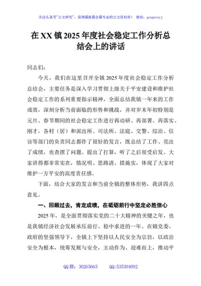 / 在XX镇2025年度社会稳定工作分析总结会上的讲话