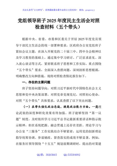 / 党组领导班子2025年度民主生活会对照检查材料(五个带头)