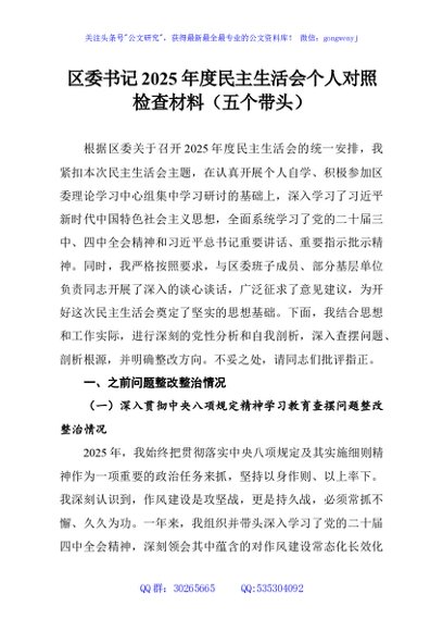/ 区委书记2025年度民主生活会个人对照检查材料(五个带头)