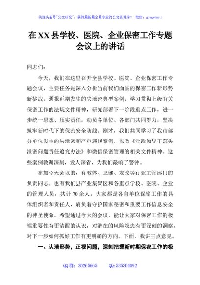/ 在XX县学校、医院、企业保密工作专题会议上的讲话