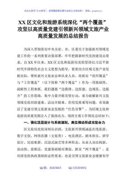 / XX区文化和旅游系统深化“两个覆盖”攻坚以高质量党建引领新兴领域文旅产业高质量发展的总结报告