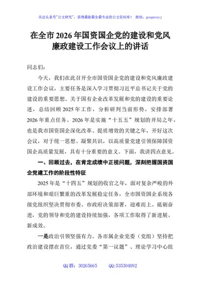/ 在全市2026年国资国企党的建设和党风廉政建设工作会议上的讲话