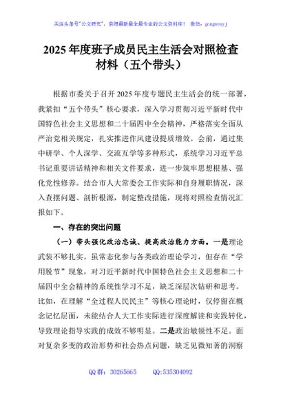 / 2025年度班子成员民主生活会对照检查材料(五个带头)