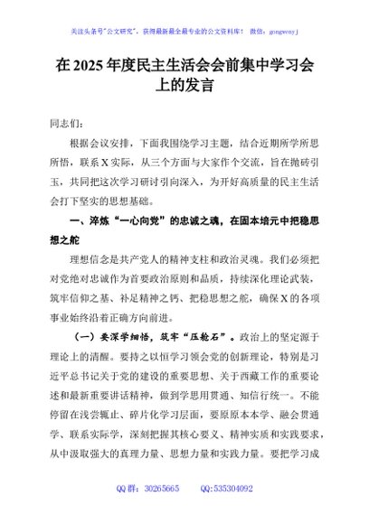 / 在2025年度民主生活会会前集中学习会上的发言