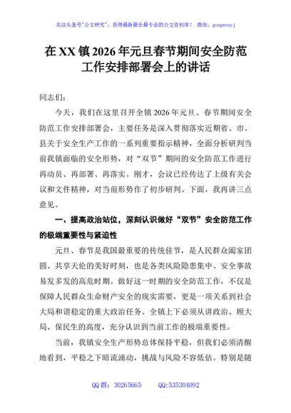 / 在XX镇2026年元旦春节期间安全防范工作安排部署会上的讲话