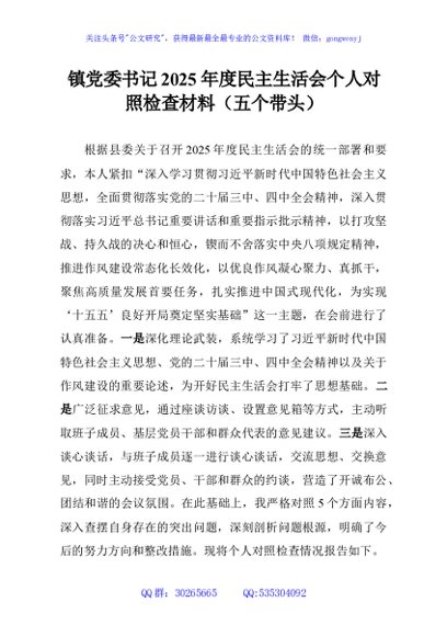 / 镇党委书记2025年度民主生活会个人对照检查材料(五个带头)