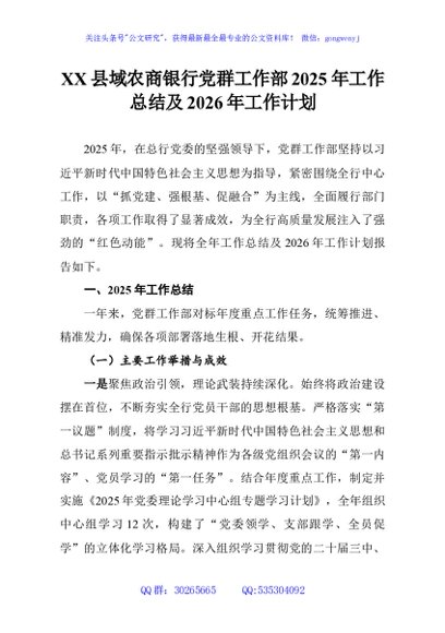 / XX县域农商银行党群工作部2025年工作总结及2026年工作计划