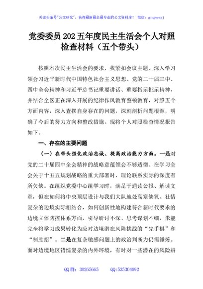 / 党委委员202五年度民主生活会个人对照检查材料(五个带头)