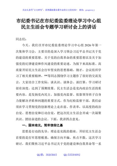 / 市纪委书记在市纪委监委理论学习中心组民主生活会专题学习研讨会上的讲话