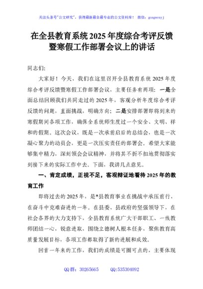 / 在全县教育系统2025年度综合考评反馈暨寒假工作部署会议上的讲话