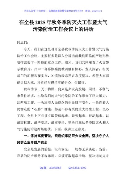 / 在全县2025年秋冬季防灭火工作暨大气污染防治工作会议上的讲话