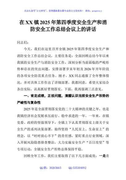 / 在XX镇2025年第四季度安全生产和消防安全工作总结会议上的讲话