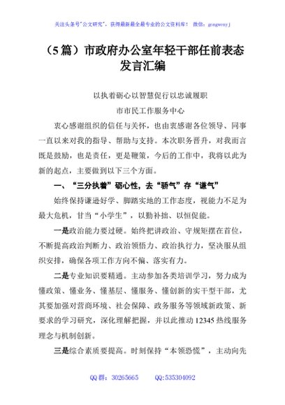 / (5篇)市政府办公室年轻干部任前表态发言汇编