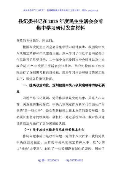 / 县纪委书记在2025年度民主生活会会前集中学习研讨发言材料