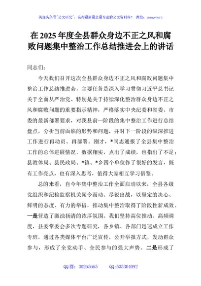 / 在2025年度全县群众身边不正之风和腐败问题集中整治工作总结推进会上的讲话