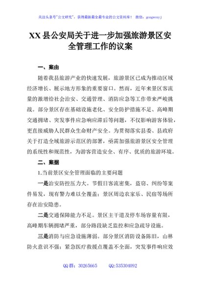 / XX县公安局关于进一步加强旅游景区安全管理工作的议案