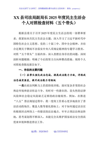 / XX县司法局副局长2025年度民主生活会个人对照检查材料(五个带头)