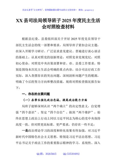 / XX县司法局领导班子2025年度民主生活会对照检查材料