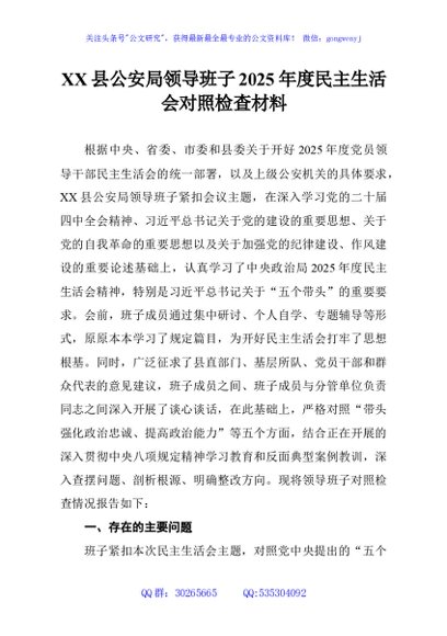 / XX县公安局领导班子2025年度民主生活会对照检查材料