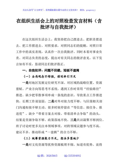 / 在组织生活会上的对照检查发言材料(含批评与自我批评)