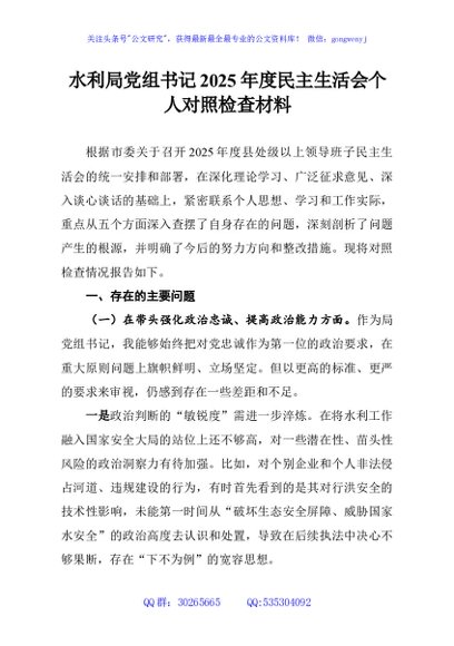 / 水利局党组书记2025年度民主生活会个人对照检查材料