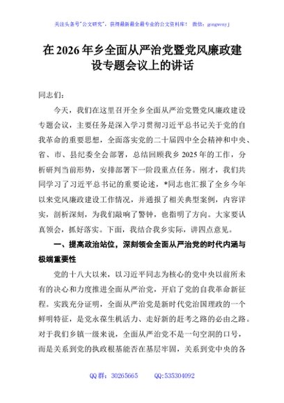 / 在2026年乡全面从严治党暨党风廉政建设专题会议上的讲话