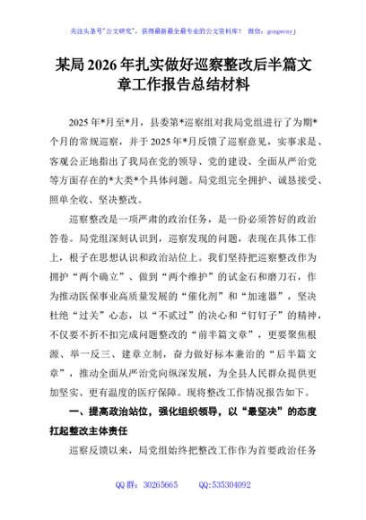 / 某局2026年扎实做好巡察整改后半篇文章工作报告总结材料