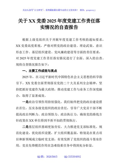 / 关于XX党委2025年度党建工作责任落实情况的自查报告
