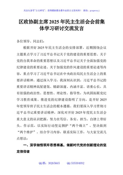 / 区政协副主席2025年民主生活会会前集体学习研讨交流发言