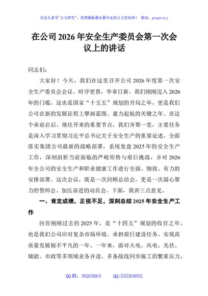 / 在公司2026年安全生产委员会第一次会议上的讲话