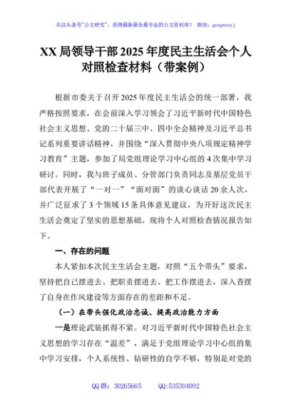 / XX局领导干部2025年度民主生活会个人对照检查材料(带案例)