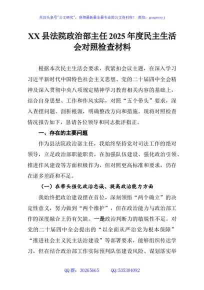 / XX县法院政治部主任2025年度民主生活会对照检查材料