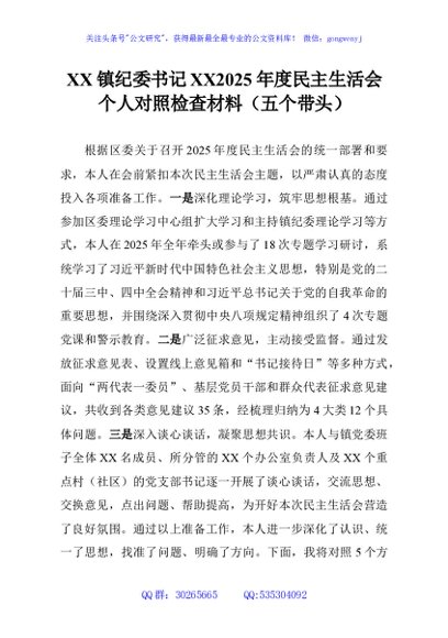 / XX镇纪委书记XX2025年度民主生活会个人对照检查材料(五个带头)