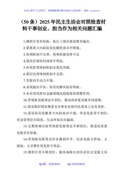 / (50条)2025年民主生活会对照检查材料干事创业、担当作为相关问题汇编