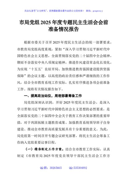 / 市局党组2025年度专题民主生活会会前准备情况报告