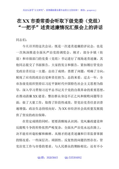 / 在XX市委常委会听取下级党委(党组)“一把手”述责述廉情况汇报会上的讲话