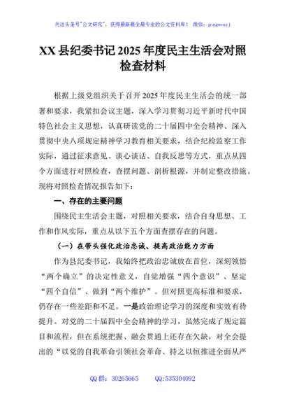 / XX县纪委书记2025年度民主生活会对照检查材料